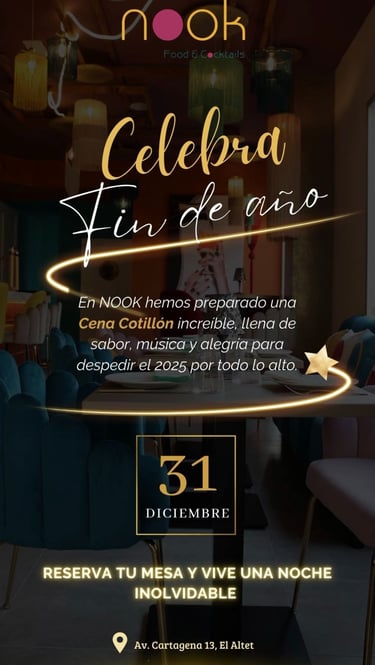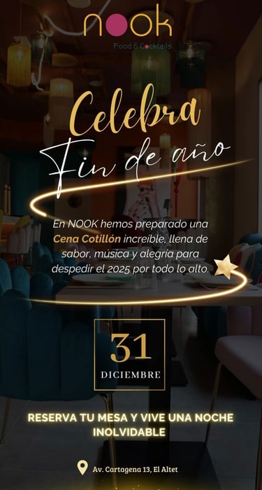 NOOK se perfila como una experiencia gastronómica mediterránea de primera clase e informal en ALICANTE Con su ambiente íntimo y sabores inigualables, es el lugar ideal para un desayuno ,una comida o una cena. Ubicado en EL ALTET, los comensales disfrutan de UN REFUGIO DONDE DISFRUTAR Y DESCONECTAR DONDE HASTA EL MAS MINIMO DETALLE TIENE SENTIDO